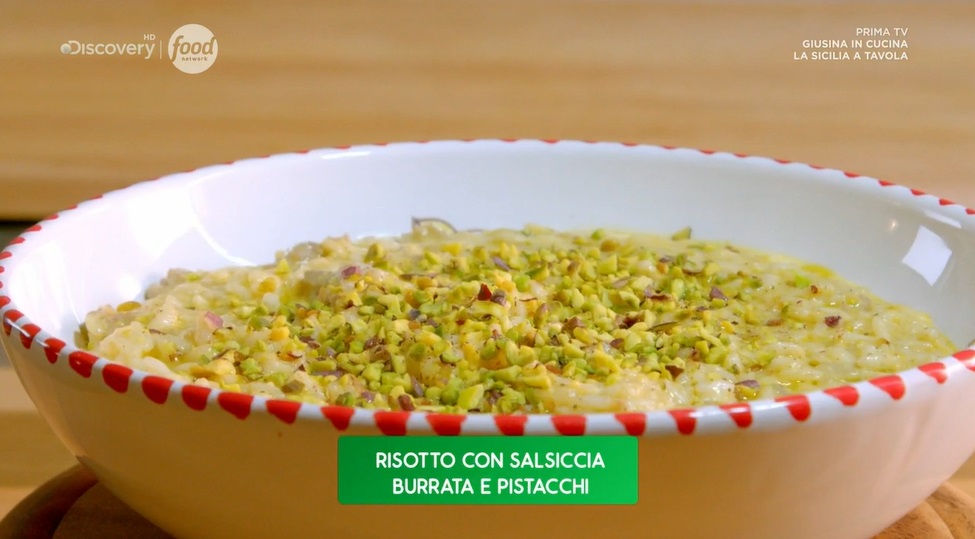- 300 g riso, granella di pistacchi, 250 g pesto di pistacchi, 350 g salsiccia, mezza cipolla, sale, pepe, 50 g parmigiano grattugiato, brodo vegetale, 300 g burrata, vino bianco