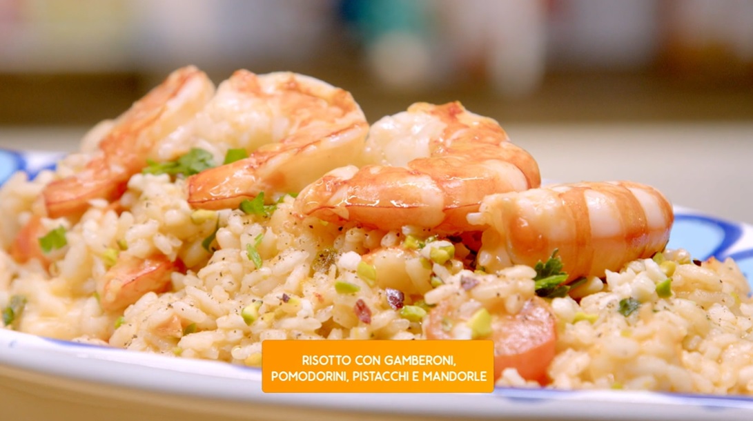 - 500 g gamberoni, 300 g riso arborio, 400 g pomodorini, 1 spicchio d’aglio, pepe, basilico, prezzemolo, pistacchi tritati, mandorle in granella, olio evo, 1 bicchiere di vino bianco