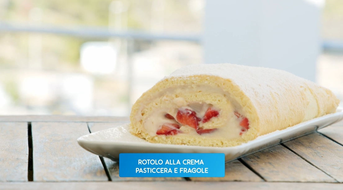 Spalmiamo la crema con le fragole sul pan di Spagna ormai freddo. Arrotoliamo il pan di Spagna sulla crema, ben stretto, partendo dal lato lungo. Finiamo con zucchero a velo.