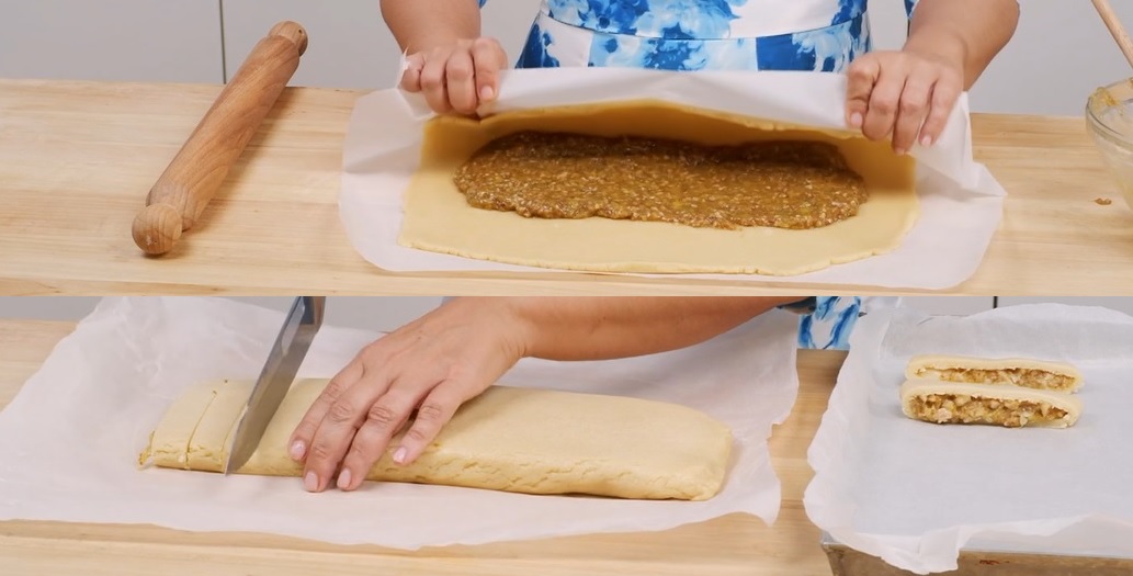 Stendiamo la frolla in modo da ottenere un rettangolo sottile. Spalmiamo al centro la composta di fichi, lasciando liberi i bordi. Ripieghiamo la frolla sul ripieno, in modo da creare un rotolo, come fosse uno strudel. Sigilliamo le estremità e lo mettiamo a riposare in freezer per almeno 1 ora. Una volta ben freddo, lo tagliamo a fette spesse circa 2 cm. Posizioniamo le fette su una teglia con carta forno e cuociamo in forno caldo e statico a 200° per 20 minuti circa.