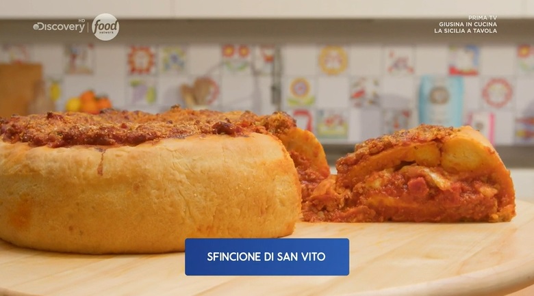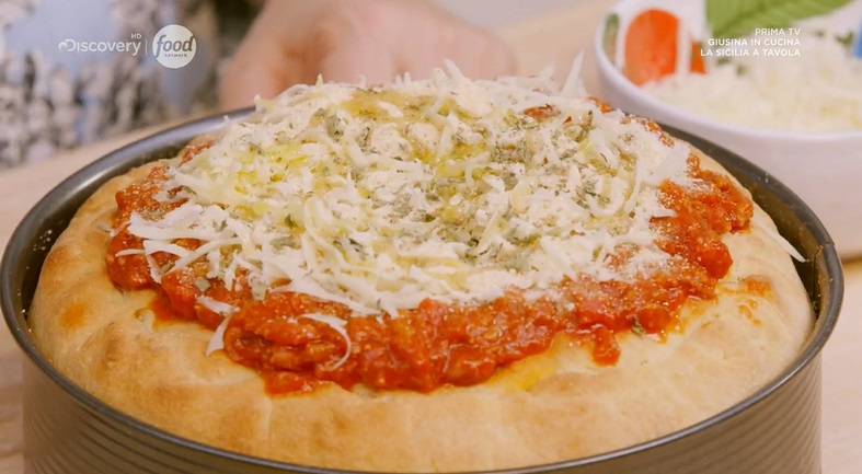Foderiamo una tortiera a cerniera ben unta d’olio con un disco di impasto. Spalmiamo una dose generosa di ragù alla base dello sfincione, adagiamo sopra il primosale (provola, pecorino, tuma) a fette e copriamo con l’altro disco di pasta. Sigilliamo bene i bordi e bucherelliamo la superficie con una forchetta. Cuociamo in forno caldo e statico a 220° per 20 minuti.