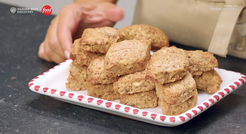Con le mani, appiattiamo l’impasto sul piano all’altezza di circa 2 cm. Ritagliamo dei rombi, che disponiamo su una teglia con carta forno. Cuociamo in forno caldo e statico a 180° per 10 minuti: devono diventare croccanti.