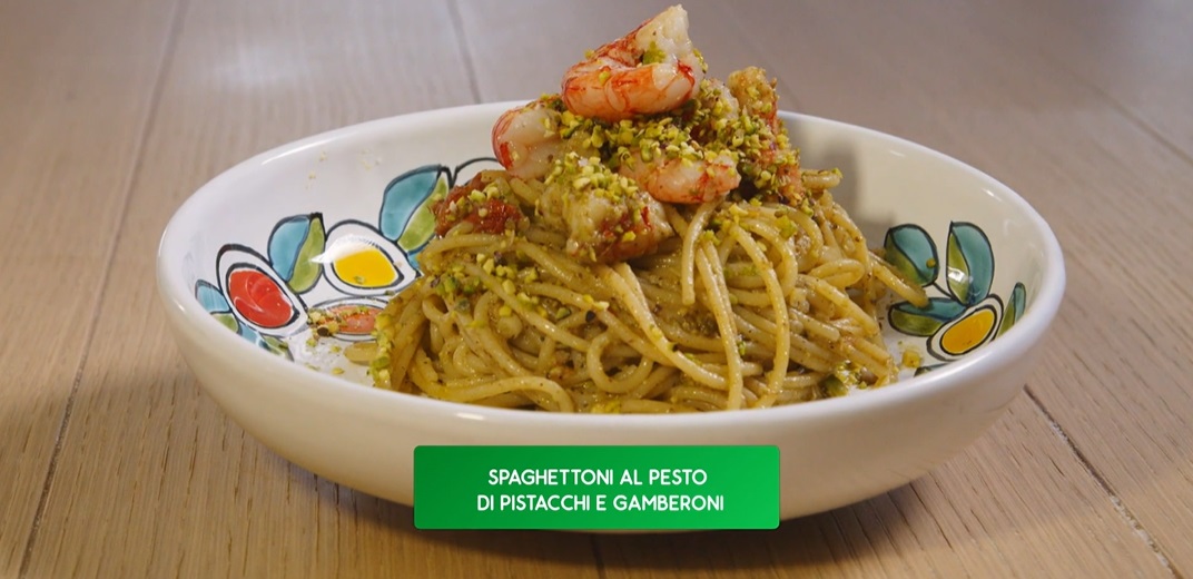 - 5-6 pomodorini, trito di pistacchi, 500 g gamberoni rossi di Mazara, pesto di pistacchi, 1 cipollotto, 1 bicchire di vino bianco, latte, 300 g spaghettoni, olio evo