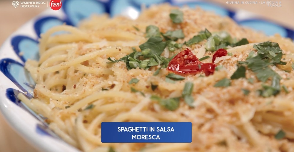 - 400 g spaghetti, succo di 1 arancia, succo di 1 limone, 1 spicchio d’aglio, peperoncino, prezzemolo, sale, olio evo, pangrattato, caciocavallo grattugiato, 60 g bottarga di tonno, cannella, un pizzico di zucchero, 1 cucchiaio di aceto