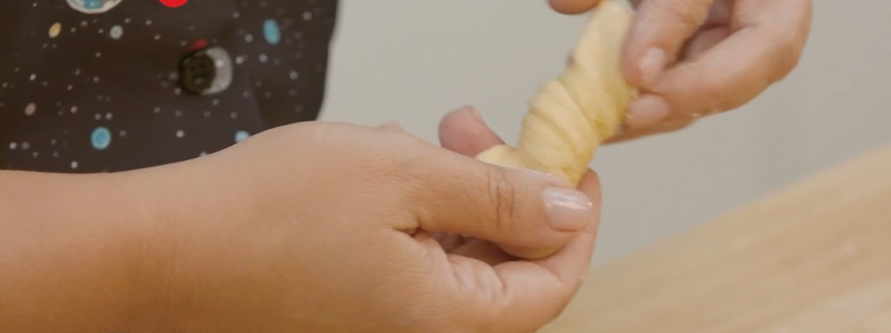 Formiamo dei filoncini, che tagliamo a listarelle lunghe circa 5-8 cm. Attorcigliamo ogni listarella su se stessa, formando una sorta di elica. Li disponiamo su una teglia con carta forno e cuociamo in forno caldo e statico a 200° per 20 minuti o fino a leggera doratura.
