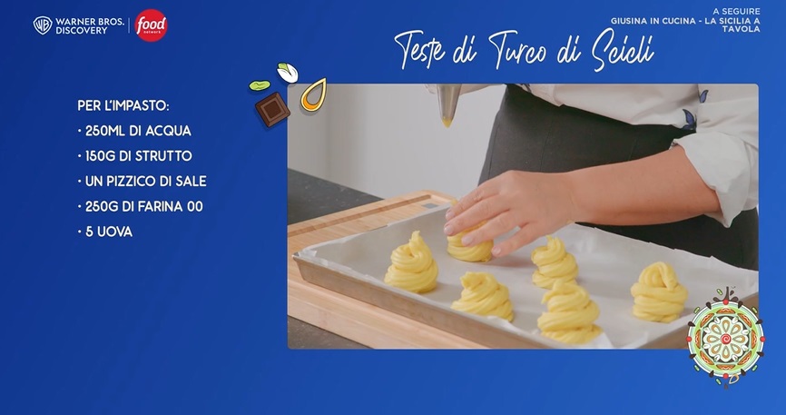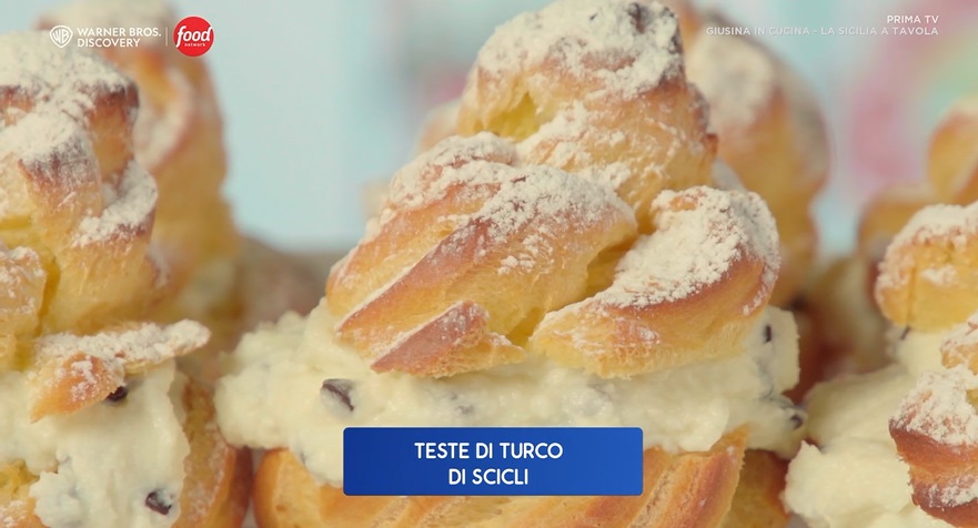 Nelle nuove puntate della serie di Food Network Giusina in cucina, dedicata alla cucina siciliana preparata in maniera semplice, ‘casalinga‘, in onda sabato 13 gennaio, alle 15:45, sul canale 33, Giusina Battaglia, giornalista ed appassionata di cucina, ha preparato un menu squisitamente siciliano, rivelando la ‘sua‘ ricetta delle teste di turco di Scicli. Trovate le ricette di Giusina nel suo nuovo libro, da poco in libreria, e sul suo sito, giusinaincucina.com. Di seguito gli ingredienti necessari ed il procedimento.