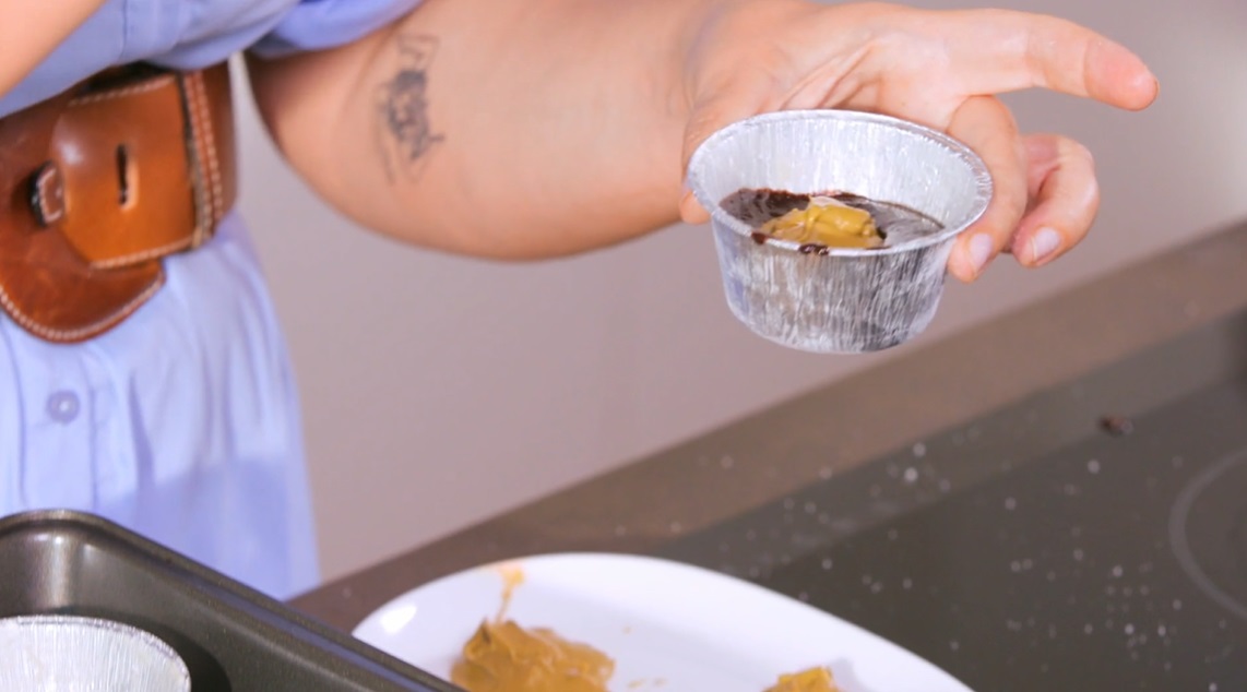 Prepariamo l’impasto: in un pentolino, a fiamma dolce, sciogliamo il burro insieme al cioccolato fondente a pezzetti. Una volta sciolto il tutto, lasciamo intiepidire. Uniamo, quindi, la farina, le uova intere, il cacao in polvere, lo zucchero ed un pizzico di sale. Mescoliamo con un cucchiaio fino ad ottenere un impasto omogeneo.