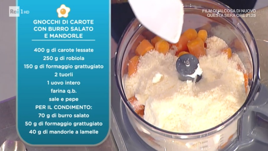- 400 g carote lessate, 250 g robiola, 150 g formaggio grattugiato, 2 tuorli, 1 uovo intero, farina, sale e pepe