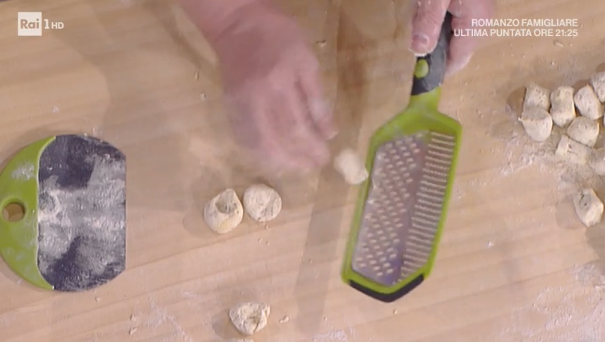 Aiutandoci con la farina, formiamo dei salsicciotti di impasto. Tagliamo quest’ultimi a tocchetti, passiamo ciascun tocchetto sullo strumento per rigare gli gnocchi o su una semplice grattugia (al contrario). Lessiamo in acqua bollente e salata. Appena vengono a galla sono pronti.