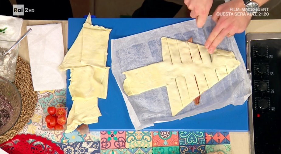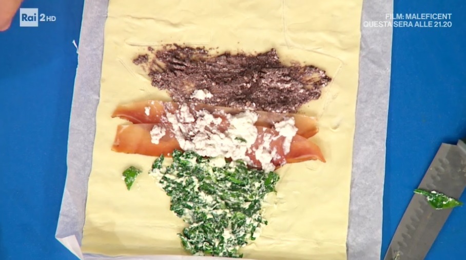 A parte mescoliamo un’altra parte di ricotta con il patè di olive. Stendiamo i due rotoli di sfoglia, li ritagliamo dando la forma del classico albero di Natale. Partiamo dal basso, dalla base, e facciamo una striscia del composto di patè e ricotta, saliamo e nella parte centrale mettiamo delle fettine di speck consopra l’ultima parte di ricotta.