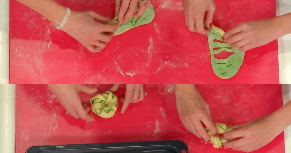 Ricaviamo dei dischetti dai due impasti. Spennelliamo la superficie di un disco bianco con po’ sciroppo di acqua e zucchero o latte; sovrapponiamo il disco al pistacchio e stendiamo un po’ con il mattarello, formando un ovale. Intagliamo tutto l’ovale (foto), quindi lo arrotoliamo su se stesso, in obliquo. Arrotoliamo il serpentello ottenuto su se stesso, a formare una chiocciola. Schiacciamo al centro e mettiamo un po’ di crema.