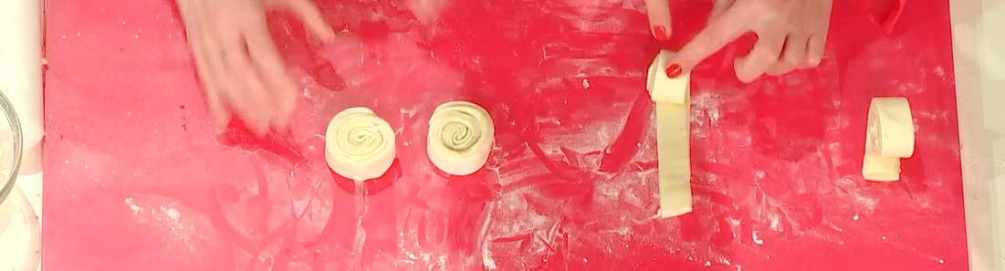 Ritagliamo il rettangolo in striscioline larghe circa 3 cm. Prendiamo una striscia e cominciamo ad arrotolarla su se stessa, a formare una girella. Le disponiamo su una teglia, copriamo e lasciamo riposare ancora 10 minuti.
