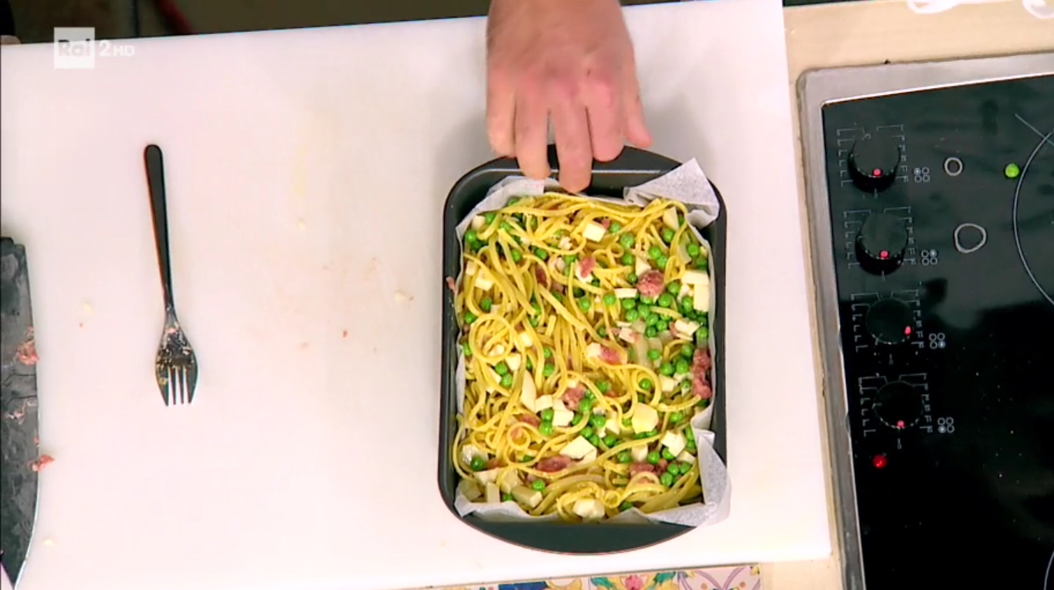 - 300 g di linguine, 4 uova, 250 g di scamorza, 200 g di salsiccia, 100 g di piselli, formaggio grattugiato,1 bustina di zafferano in polvere