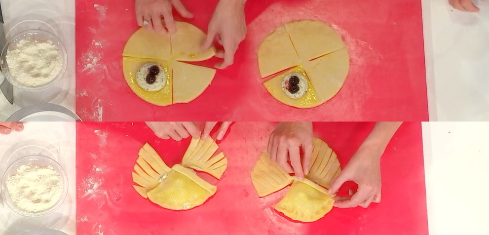 Stendiamo l’impasto ad uno spessore di 3 mm. Ricaviamo dei dischi di circa 20 cm di diametro. Pratichiamo dei tagli come in foto, in modo da ottenere 4 spicchi uniti al centro. Spennelliamo i bordi di uno spicchio con l’uovo sbattuto e, sullo stesso, mettiamo un ciuffo di crema di ricotta ed un paio di amarene sciroppate. Ripieghiamo il triangolo opposto a quello farcito sul ripieno e lo sigilliamo bene tutto intorno. Spennelliamo ancora con dell’uovo ed incidiamo gli altri due spicchi, formando due frange. Intrecciamo quest’ultime sul triangolo farcito.