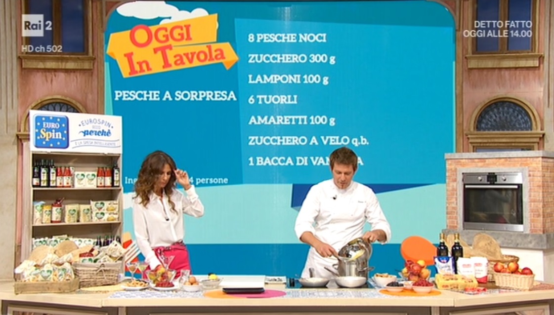 Prendiamo delle coppette o semplicemente dei bicchieri e alla base di ognuno mettiamo due cucchiai di zabaione caldo, sopra qualche fettina di pesca caramellata, ancora dello zabaione. Sbricioliamo sopra con le mani qualche amaretto. Decoriamo con lamponi e una bacca di vaniglia.