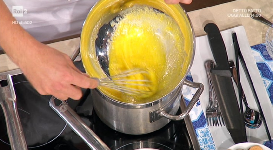 Mettiamo in una ciotola i tuorli d’uovo, aggiungiamo lo zucchero e montiamo a bagnomaria, mettendo la ciotola su una pentola con acqua che bolle. Amalgamiamo bene, ottenendo una sorta di zabaione.