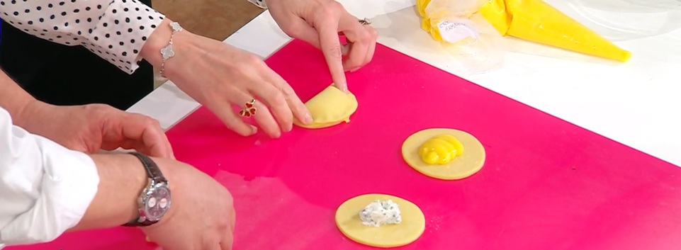 Stendiamo l’impasto ad uno spessore di 3-4 mm e ritagliamo dei dischi del diametro di 10 cm. Spennelliamo i bordi con poco albume, quindi mettiamo al centro un po’ di farcitura e chiudiamo a mezzaluna, premendo bene sui bordi. Li friggiamo in olio caldo e profondo fino a doratura. Possiamo cuocerli anche in forno caldo e statico a 180° per 18 minuti.