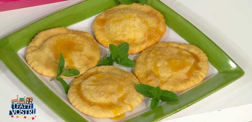 Tiriamo la sfoglia sottile, ad uno spessore di 1-2 mm. Ritagliamo dei dischi di circa 12 cm di diametro. Spennelliamo i bordi con poca acqua e posizioniamo al centro delle palline di ripieno di formaggio. Sovrapponiamo un secondo disco e pressiamo per bene sui lati, sigillandoli. Friggiamo in olio caldo e profondo a 180° fino a doratura. Scoliamo su carta assorbente e serviamo con sopra del miele leggermente scaldato e scorze d’arancia.