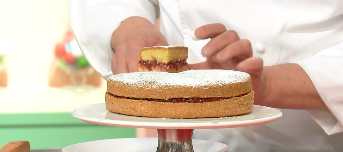Tagliamo la torta a metà e la farciamo con confettura di frutti di bosco.