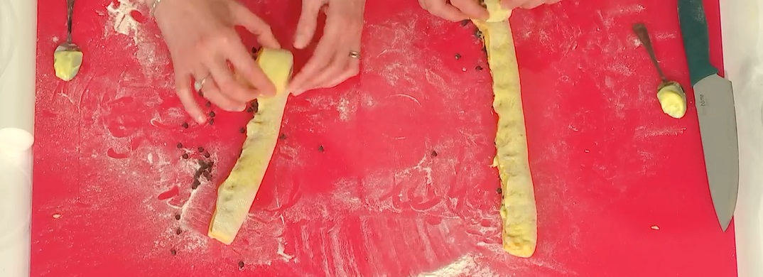 Stendiamo l’impasto sul piano, in modo da ottenere un rettangolo spesso circa 1 cm. Ritagliamo 7 rettangoli larghi circa 5-8 cm. Su ogni striscia/rettangolo ottenuto, spalmiamo della crema pasticcera e distribuiamo sopra delle gocce di cioccolato. Pieghiamo l’impasto sul ripieno, dal lato lungo. Arrotoliamo ogni lingua ottenuta su se stessa, dal lato corto: otterremo le nostre rose. Le disponiamo all’interno di una tortiera imburrata, copriamo e lasciamo lievitare ancora 2 ore.