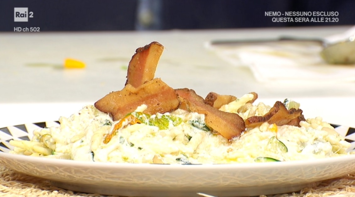 Serviamo decorando con le fettine di guanciale croccante e il resto di zucchine e pinoli.