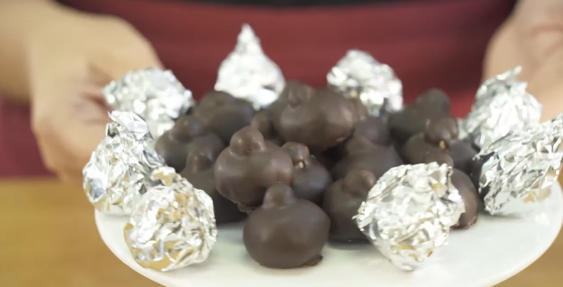 Formiamo delle palline grandi come noci e, su ognuna, incastoniamo una nocciola intera. Posizioniamo i baci su una grata e coliamo sopra il cioccolato fondente fuso, facendo colare via l’eccesso. Lasciamo indurire il cioccolato in frigorifero per circa 2 ore.