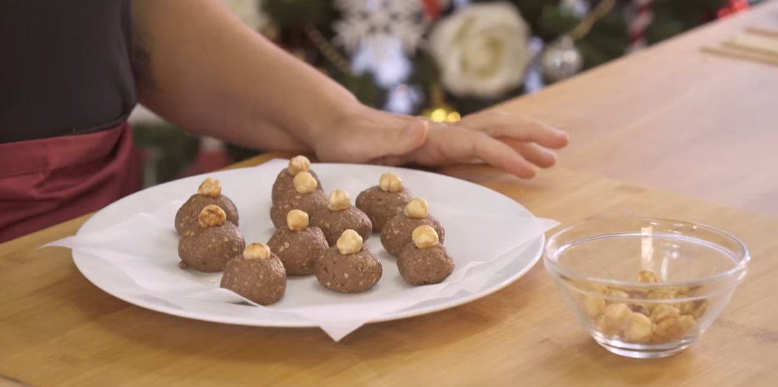 - 100 g di granelle di nocciole, 100 g di farina di mandorle, 120 g di crema spalmabile alle nocciole, nocciole intere qb, cioccolato di copertura