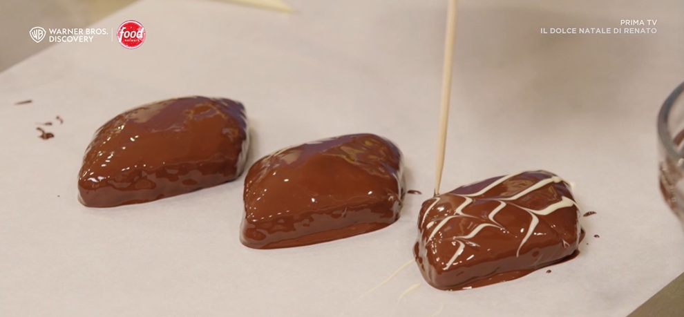 Una volta freddi, li intingiamo completamente nel cioccolato fondente fuso, aiutandoci con delle forchette. Li posizioniamo sulla carta forno e li lasciamo asciugare. Possiamo anche decorarli, facendo colare sopra del cioccolato bianco fuso e ‘rigandoli’ con uno stuzzicadenti (foto).