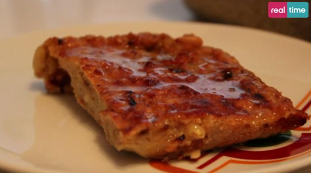 Quando il pane è bello morbido strizzarlo in un colino per eliminare l’acqua in eccesso. Versare le azzime strizzate e sbriciolate in una ciotola, aggiungere le uova intere, lo zucchero, un pizzico di sale, l’uva passa e i pinoli, mescolando bene il tutto e aggiungendo un po’ di cacao amaro a piacere. Versare il composto in una teglia unta con olio e cuocere in forno a 180 °C. Dopo 10 minuti ridurre la temperatura a 60 °C e fare continuare a cuocere per un’altra ora e un quarto.