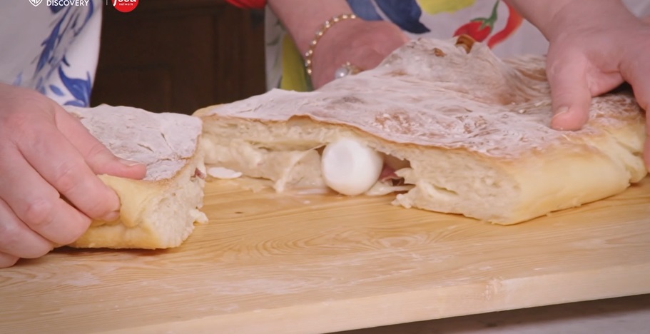 Con le mani, stendiamo l’impasto sul piano infarinato, formando un rettangolo spesso circa 1-2 cm. Disponiamo su un lato le uova sode intere, la mozzarella a pezzetti, le fettine di salame, fiocchi di burro, pepe macinato, una spolverata di parmigiano grattugiato, quindi ripieghiamo l’altra metà dell’impasto sul ripieno, sigillando bene i bordi.