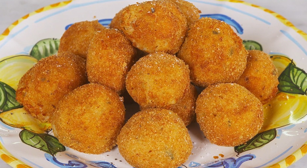 Formiamo le polpette e le passiamo nelle uova sbattute e, successivamente, nel pangrattato. Le friggiamo in olio caldo e profondo fino a doratura.