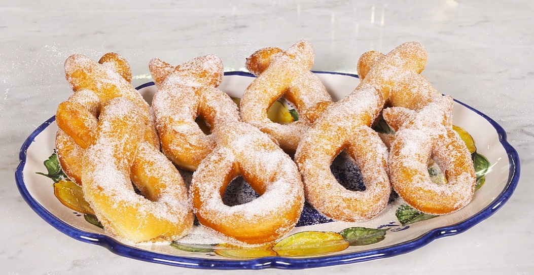 Preleviamo dei pugnetti di impasto, a cui diamo la forma di serpentelli che intrecciamo a formare la zeppola. Le disponiamo su una teglia con carta forno, le copriamo e le lasciamo lievitare ancora fino al raddoppio.
