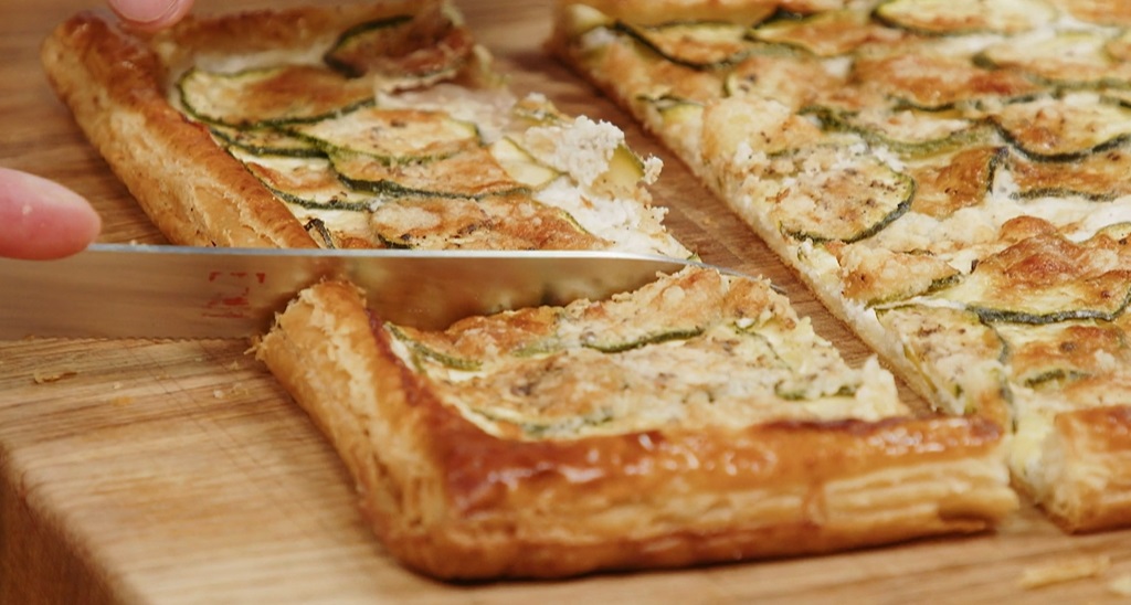 Srotoliamo il rettangolo di pasta sfoglia direttamente sulla teglia del forno. Pratichiamo delle incisioni superficiali lungo il bordo, con la punta di un coltello: lasciamo 1-2 cm dal bordo. Spennelliamo il bordo creato con l’uovo sbattuto. Spalmiamo la crema di formaggio sulla parte centrale, lasciando puliti i bordi. Sulla crema di formaggi, adagiamo le zucchine a rondelle, sovrapponendole leggermente. Le saliamo, pepiamo, spolveriamo con abbondante parmigiano grattugiato e cuociamo in forno caldo e statico a 200° per 25 minuti; la facciamo cuocere ancora 10 minuti nella parte bassa del forno.