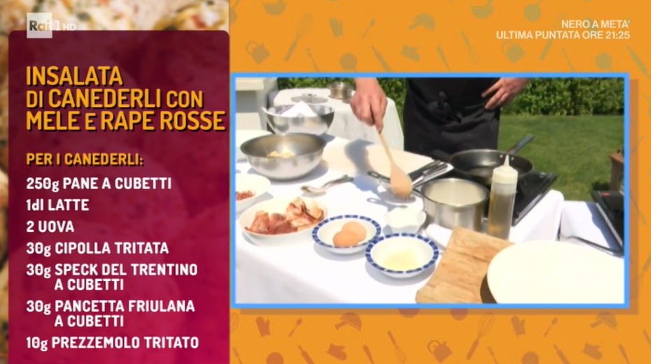 - Canederli: 250 g pane a cubetti, 1 dl latte, 2 uova, 30 g cipolla tritata, 30 g speck a cubetti, 30 g pancetta a cubetti, 10 g prezzemolo