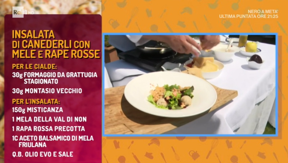 - Insalata: 150 g misticanza, 1 mela, 1 rapa rossa precotta, 1 cucchiaio aceto balsamico di mela, olio evo, sale