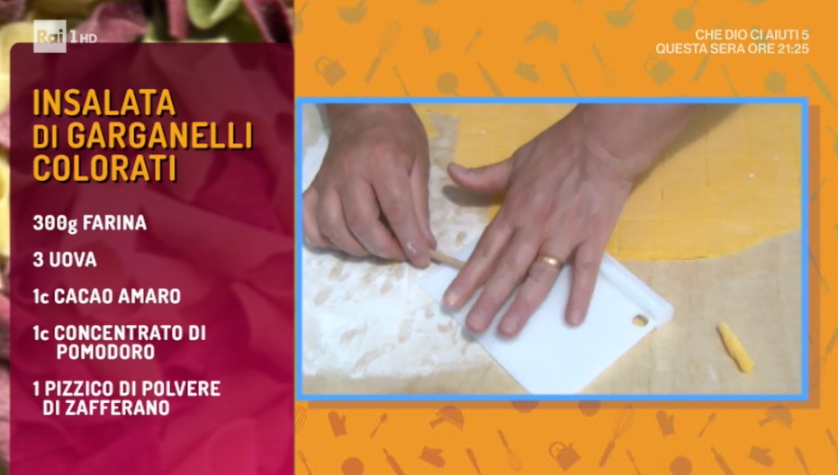 Per la sfoglia, lavoriamo la farina con le uova intere. Dividiamo in tre panetti di egual misura e, ad ognuno, aggiungiamo un po’ di zafferano in polvere, oppure un cucchiaino di cacao o di concentrato di pomodoro. Lavoriamo i tre panetti fino a renderli omogenei nel colore. Avvolgiamo i panetti nella pellicola e lasciamo riposare per mezz’ora. Tiriamo la sfoglia sottile, la tagliamo in quadratini e li avvolgiamo intorno ad un legnetto, unendo due vertici. Otterremo i garganelli (simili a delle penne). Li cuociamo in acqua bollente e salata per il tempo necessario. Li scoliamo, li raffreddiamo, distanziandoli su un piatto, e li condiamo con del succo di limone.