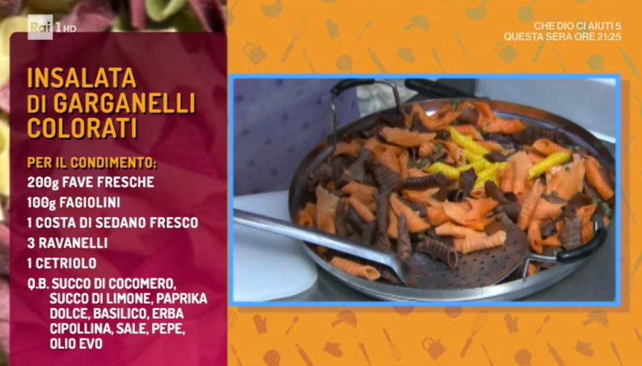 In una ciotola, mettiamo un trito di fine di basilico ed erba cipollina. Uniamo le fave sgranate e crude, il sedano affettato sottile, cetrioli e ravanelli a lamelle, la polpa dell’anguria, olio, paprika e sale. Mescoliamo, uniamo i garganelli ed i fagiolini, mescoliamo ancora e serviamo.