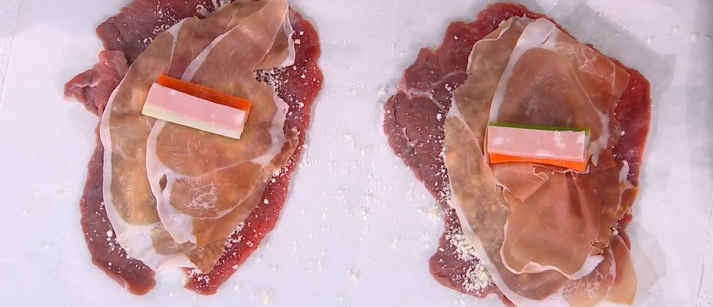 Disponiamo le fette di carne sul piano e le spolveriamo con abbondante pecorino grattugiato. Su ogni fetta mettiamo una fettina di prosciutto crudo affettato, quindi al centro posizioniamo listarelle di carota, sedano e mortadella. Ripieghiamo la carne sul ripieno, sigillandolo bene all’interno. Fermiamo l’involtino con uno stuzzicadenti.