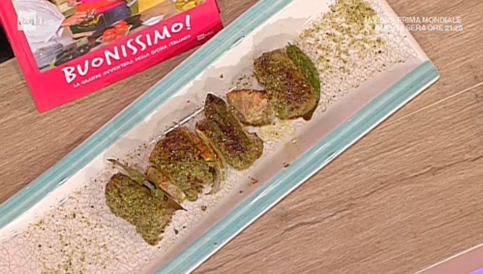 Al centro di ogni fettina di pesce spada, mettiamo un po’ del ripieno preparato. Arrotoliamo, in modo da formare l’involtino e sigillare all’interno il ripieno. Passiamo gli involtini nella farina di pistacchio e li inseriamo su degli stecchi da spiedino, alternandoli a fette di cipolla, foglie di alloro e fettine di arancia e limone. Facciamo dorare gli involtini in una padella ben calda con un filo d’olio per pochi istanti, quindi li finiamo di cuocere in forno caldo a 180° per 10 minuti.