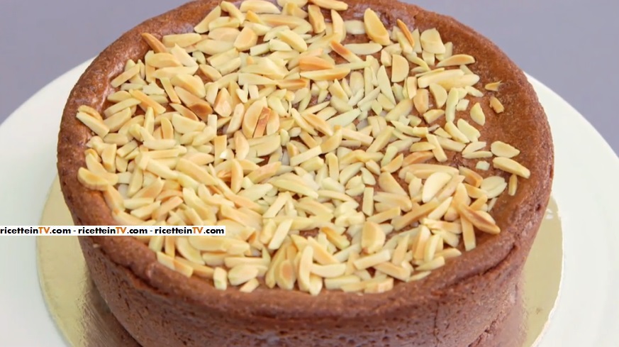 Dividiamo l’impasto in due parti. Stendiamo una parte e la mettiamo alla base di una tortiera imburrata. Riempiamo con la crema al cioccolato. Stendiamo anche la seconda parte di frolla e copriamo la crema al cioccolato con il disco ottenuto. Eliminiamo l’eccesso di frolla, dai bordi. Spennelliamo con l’albume d’uovo e spolveriamo con le mandorle. Inforniamo a 180° per 40-45 minuti. Da fredda, spolveriamo con zucchero a velo.