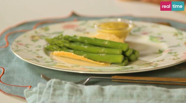 Per servire: per sbianchire gli asparagi, pareggiarli, sciacquarli e puoi cuocerli per 3 – 5 minuti in acqua bollente salata. Scolarli e sciacquarli sotto l’acqua, poi trasferirli per qualche minuto in una ciotola con acqua e ghiaccio – la tecnica è la stessa usata per i fagiolini nella lezione dell’insalata nizzarda. Per la salsa alla senape emulsionare insieme in una ciotolina lo yogurt, la senape, l’olio e il succo di limone.