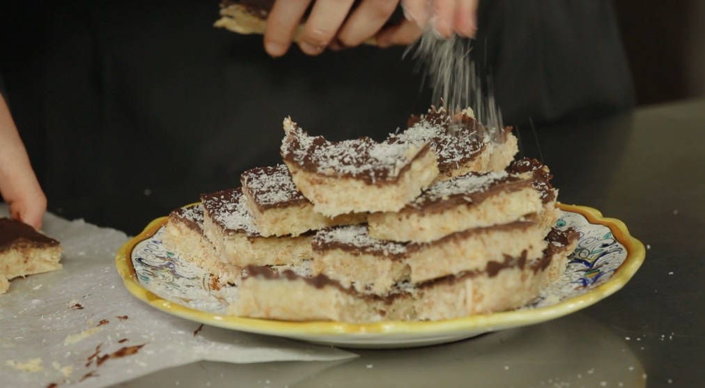In un’altra ciotola mettiamo la farina di cocco ed aggiungiamo la miscela di latte, burro e zucchero. Mescoliamo il tutto per bene ed uniamo anche i biscotti secchi in polvere. Ottenuto un composto omogeneo, lo trasferiamo all’interno di una teglia rivestita con carta forno. Lo livelliamo con un cucchiaio e versiamo sopra il cioccolato fondente fuso, livellando anch’esso su tutta la superficie. Mettiamo a riposare in frigorifero.