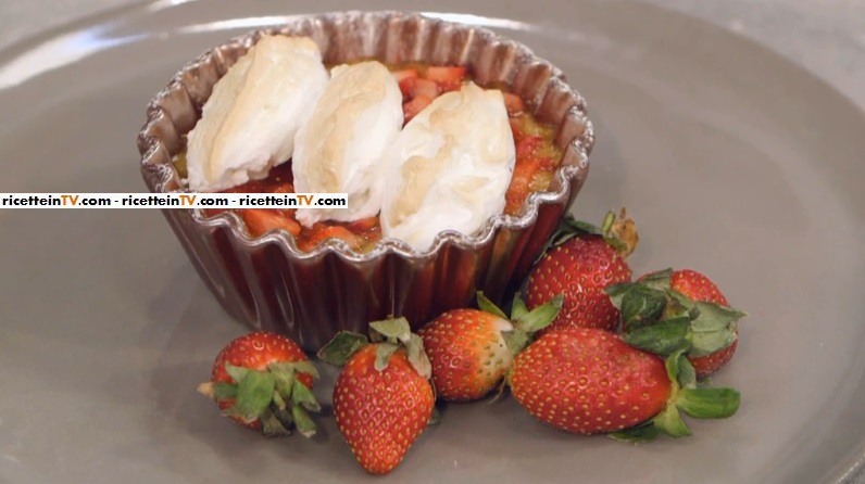Frullare la polpa di albicocche con lo zucchero. Tagliare a cubetti le fragole e farle insaporire con il succo, la scorza di lime e lo zucchero. Montare a neve gli albumi con un pizzico di sale e lo zucchero. Versare nella cocotte la salsa di albicocche, le fragole e infine la meringa. Ripassare in forno a 200° per un paio di minuti. Completare con lo zucchero a velo, prima di servire.