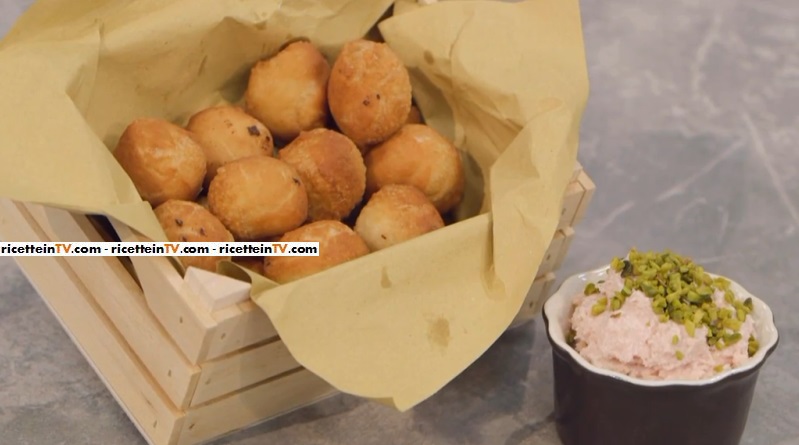 - 150 g di mortadella, 100 g di robiola, 2 – 3 cucchiai di panna, granella di pistacchi qb, 800 g pasta per la pizza, farina qb, olio per friggere