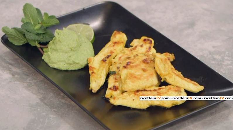 Fare marinare il pollo in un mix di olio, aglio, curcuma, menta, scorza di lime e tequila. A parte, frullare i piselli bolliti con la patata lessa, le noci, il sale, l’olio e la menta. Cuocere le bistecche di pollo sulla piastra, con il sale grosso. Sfumare con il succo di lime.