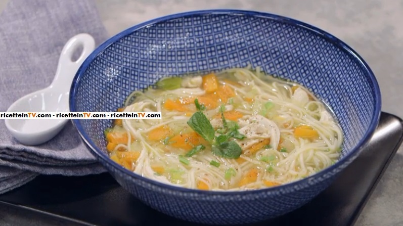 Rosolare il cipollotto con l’olio e l’aglio. Mettere anche la scorza di lime e il brodo. Tagliare a dadini il sedano e la carota e aggiungerli alla zuppa. Salare e completare con lo zenzero grattugiato, il peperoncino e la cannella. Infine, aggiungere il pollo già bollito e i noodles. Servire completando con la parte verde del cipollotto, la menta e il pepe.