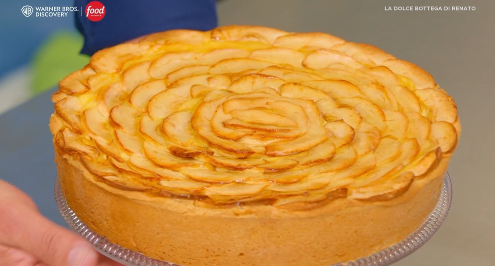 Stendiamo la frolla e la usiamo per foderare il fondo ed i bordi di una tortiera del diametro di 30 cm. Formiamo sul fondo (sopra la frolla) uno strato di pan di Spagna alto circa mezzo cm (o savoiardi) e distribuiamo sopra le mele caramellate. Copriamo con la crema e decoriamo la superficie con le mele (crude) tagliate a fettine. Cuociamo in forno caldo e statico a 180° per 50 minuti.