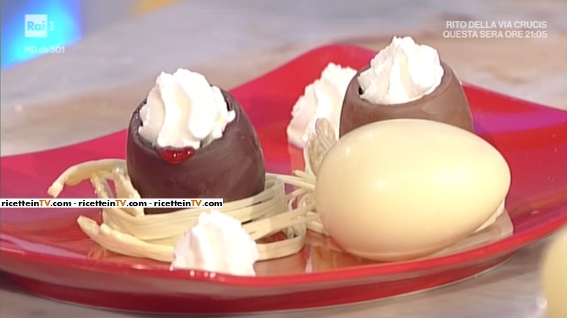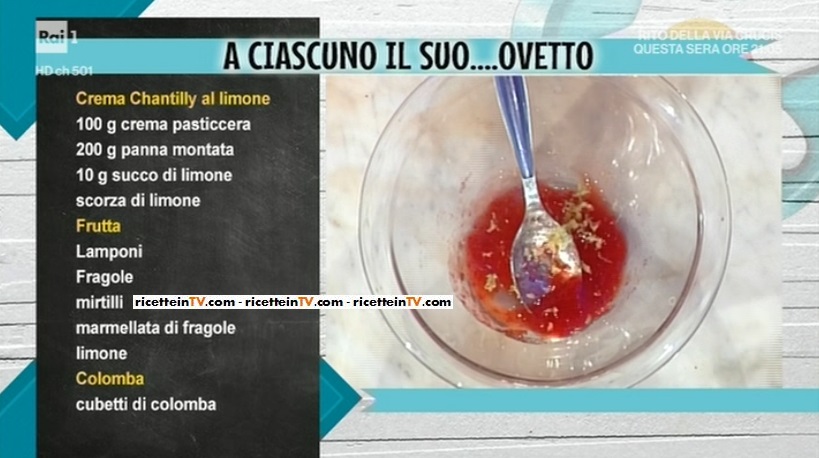 Mettiamo all’interno degli ovetti un cucchiaino di confettura e frutti rossi ed un cubetto di colomba. Copriamo con un ciuffo di chantilly. ottenuta miscelando la crema pasticcera alla panna montata.