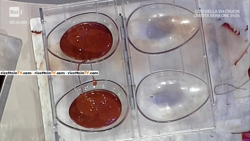 Per la fare le uova di Pasqua, bisogna dapprima fondere il cioccolato a 45°. Lo coliamo su un piano freddo, meglio se di marmo, e lo lavoriamo con una spatola, fino a toccare la temperatura di 31°, 28° per il cioccolato al latte, 26° per quello bianco.