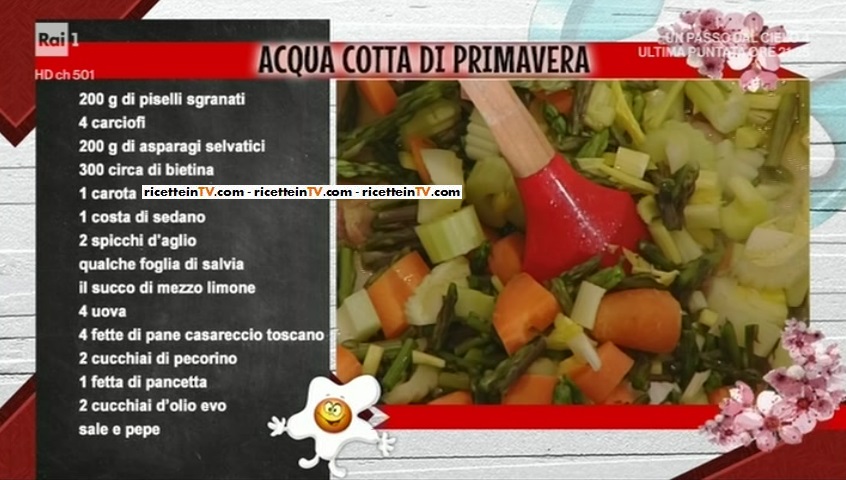 - 200 g di piselli sgranati, 4 carciofi, 200 g di asparagi selvatici, 300 g circa di bietina, 1 carota, 1 costa di sedano, 2 spicchi d’aglio, qualche foglia di salvia, il succo di mezzo limone, 4 uova, 4 fette di pane casereccio toscano, 1 fetta di pancetta, 2 cucchiai di pecorino, 2 cucchiai di olio evo, sale e pepe